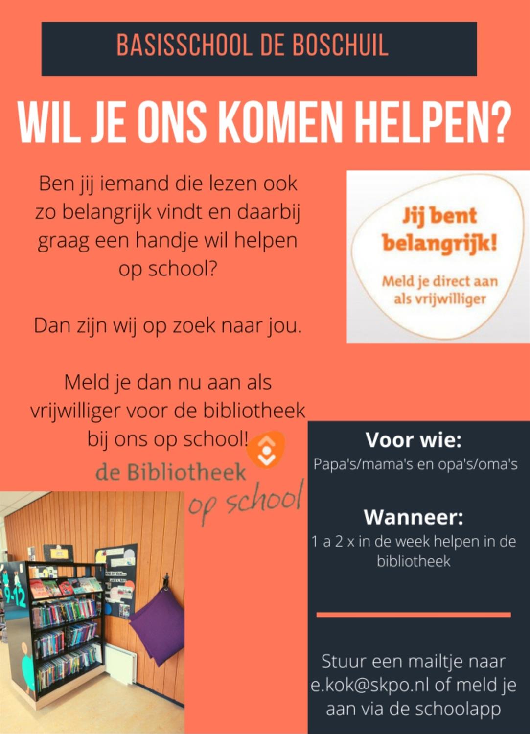We zijn nog steeds op zoek naar vrijwilligers voor de bibliotheek bij ons op school!